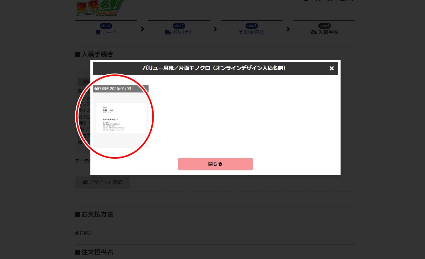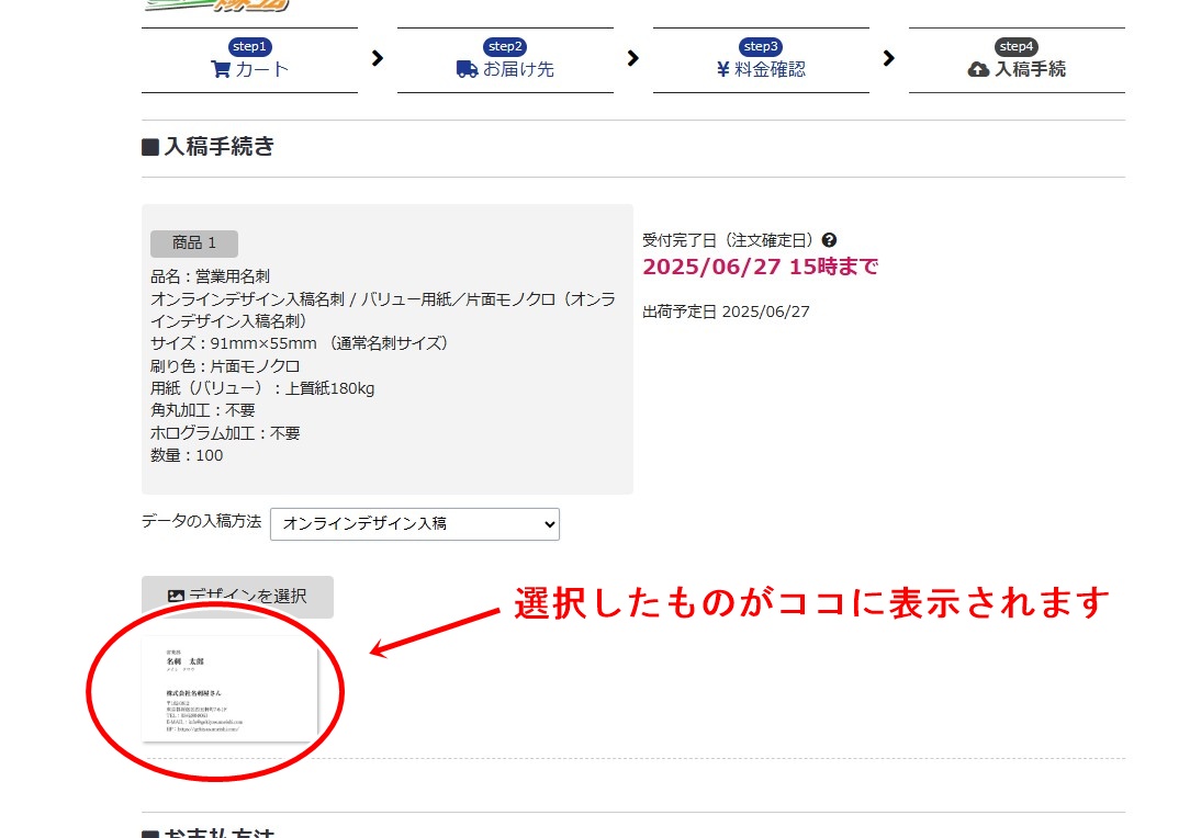 9.入稿手続き画面でデータの入稿方法を「オンラインデザイン入稿」を選択し、「デザインを選択」をクリック。