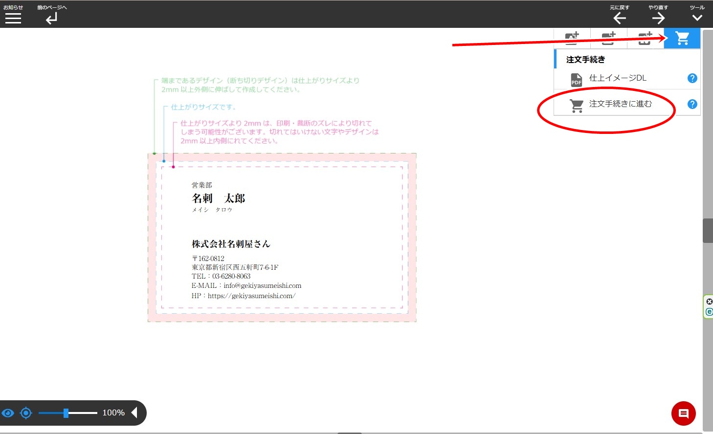 2.編集画面が表示されますので内容をご確認いただいた後、「注文手続き」→「注文手続きに進む」をクリック。