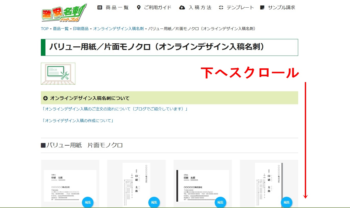 3.オンラインデザイン入稿注文ページに画面遷移しますので下へスクロール。