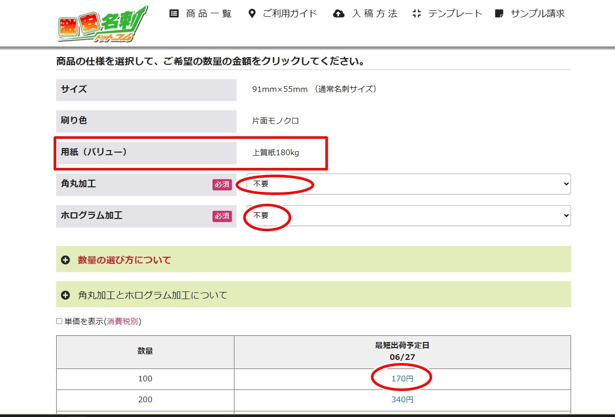 4.商品の仕様を選択する欄が出てきます。用紙と加工オプションを確認し、ご希望数量に該当する金額をクリック。