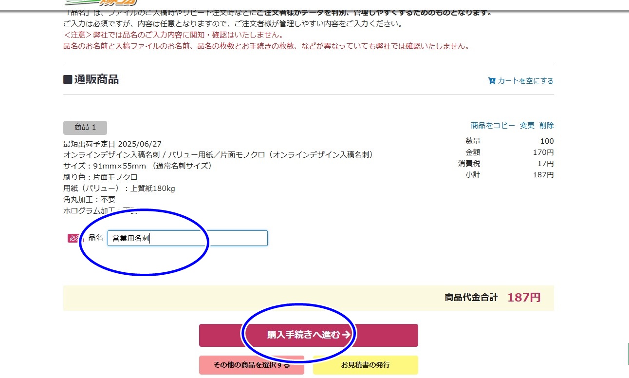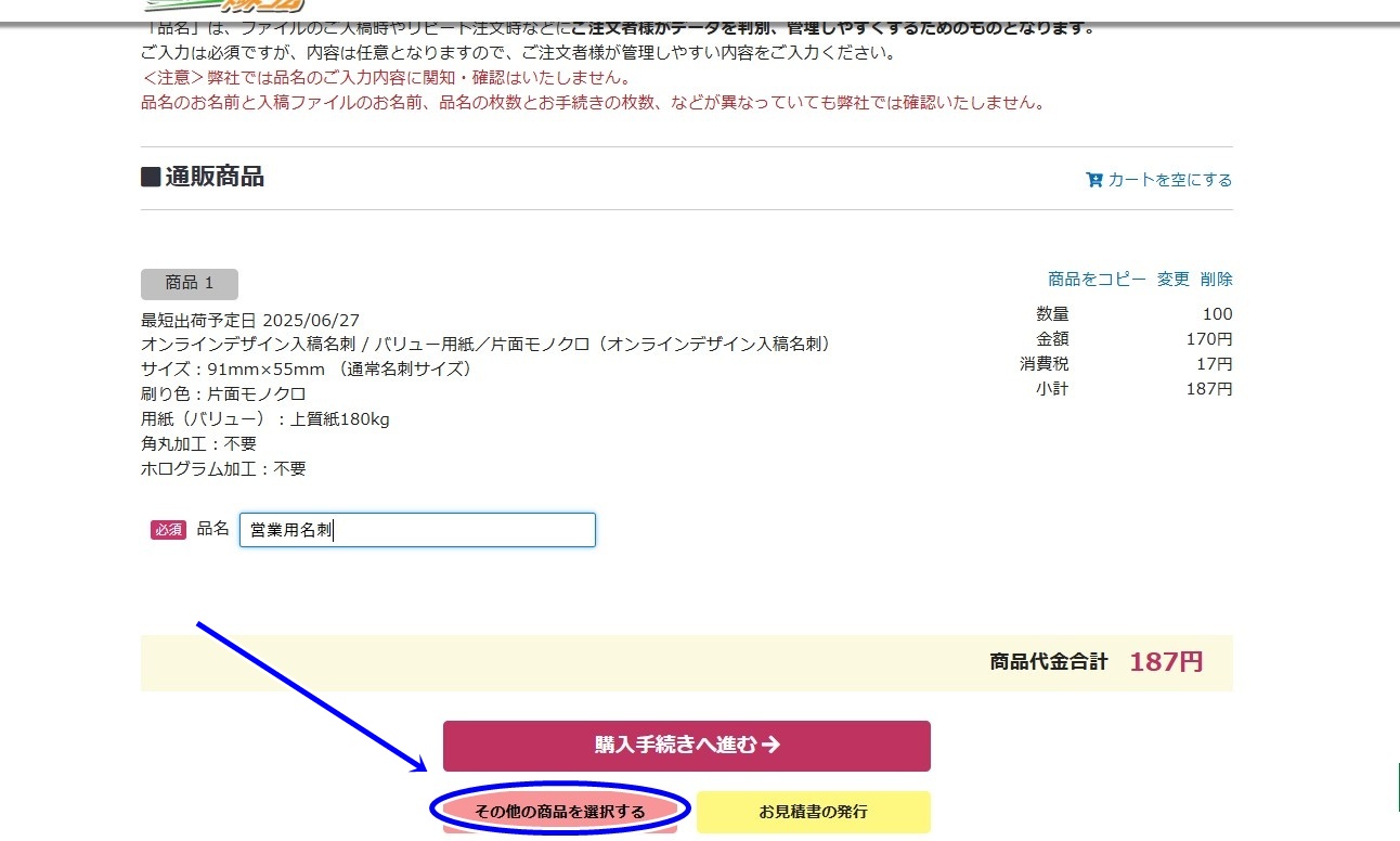 5.追加の注文がない場合、品名を入力し「購入手続きへ進む」をクリック。