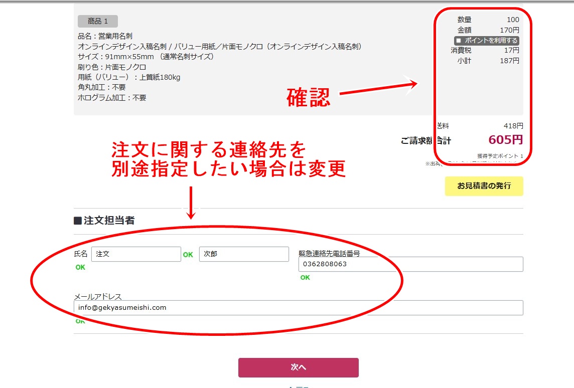 注文に関する連絡先を別途指定したい場合は「注文担当者」を変更(通常の連絡先は会員登録いただいた連絡先です)。※変更は必須ではありません。